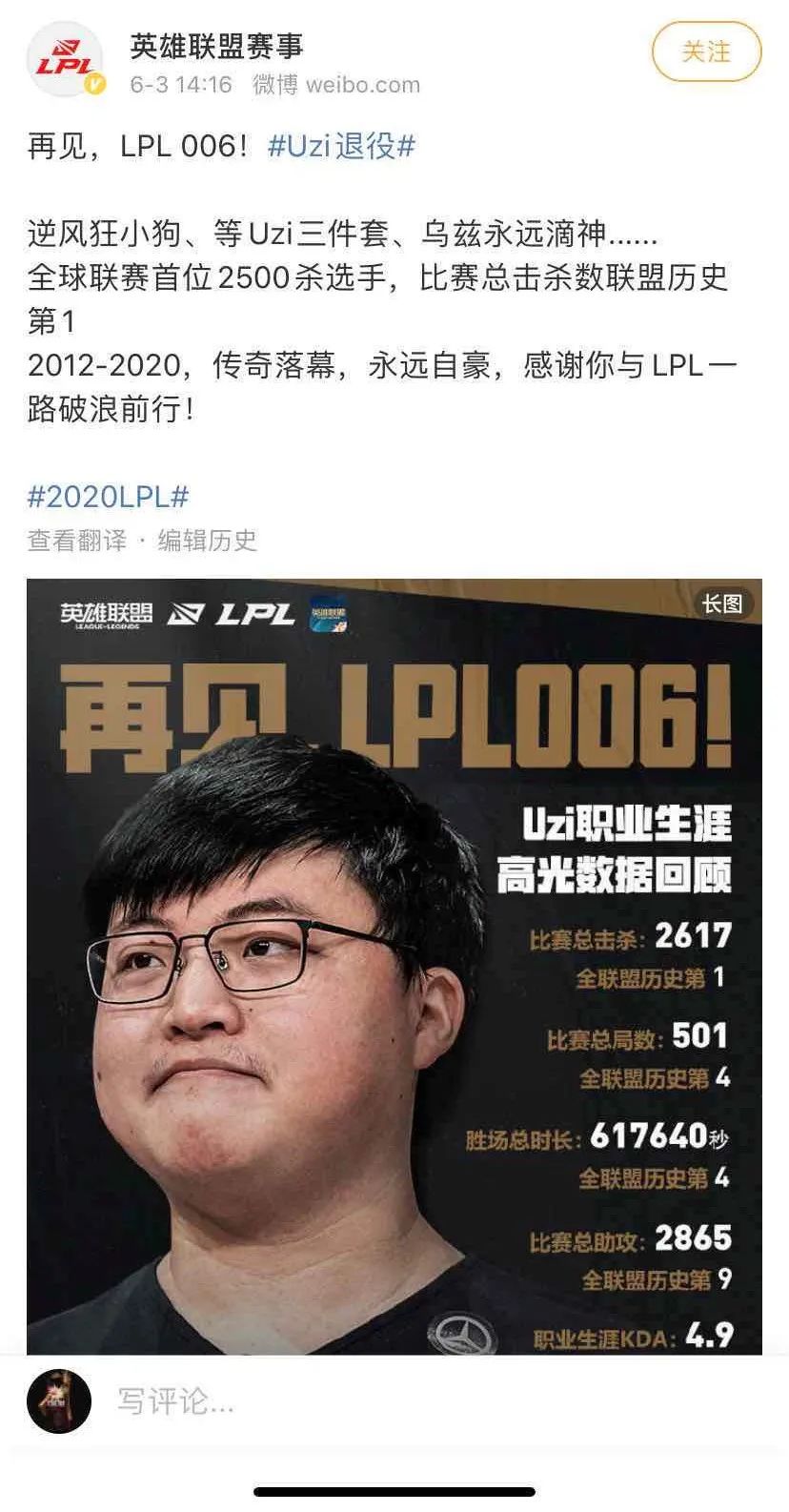 英雄联盟赛事微博也发文祝福Uzi,“2012-2020,传奇落幕,永远自豪,感谢你与LPL一路破浪前行!”